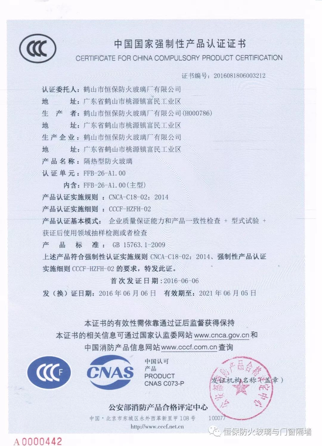 1)防火玻璃:A類隔熱型防火玻璃:需有CCC認證證書和型式試驗報告;C類非隔熱型防火玻璃:只需要提供形式檢驗報告;